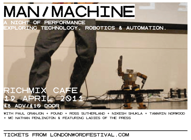 Man/Machine 13/04/201113/04/2011 ~ theotherroom 19th April, Rich Mix Tamarin Norwood, Ross Sutherland and more More HERE Share this: Click to share on Facebook (Opens in new window) Facebook Click to share on X (Opens in new window) X Like Loading... Related