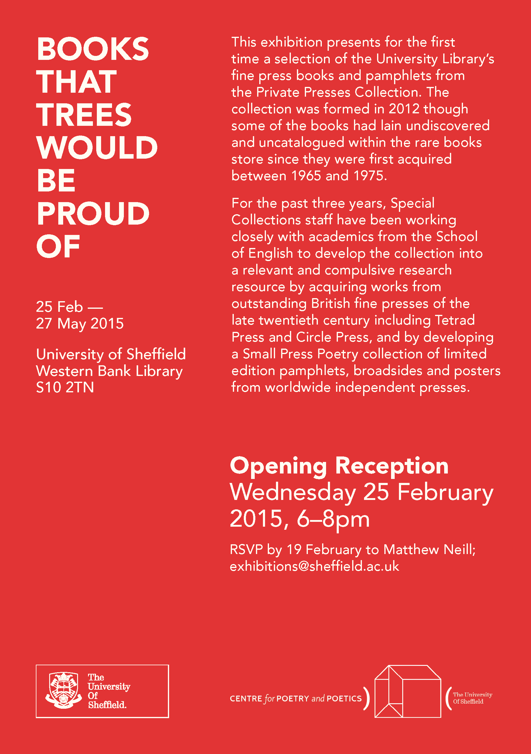 Books That Trees Would Be Proud Of 17/02/2015 ~ theotherroom More details about the Small Press Poetry Collection at Sheffield University library can be found here. Share this: Click to share on Facebook (Opens in new window) Facebook Click to share on X (Opens in new window) X Like Loading... Related