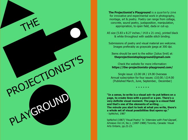 The Projectionist’s Playground publishes experimental poetry, art and photography. Issue 3 came out at the beginning of September and the zine is now inviting submissions for Issue 4, to appear in December 2017. More here.