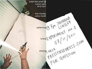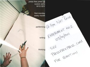 Second to perform was Becky Cremin, a performance accompanied by a projection of stills showing her in a variety of London locations over a period of twelve hours with a red scarf or thick ribbon issuing from her mouth like a blood trail or inner daemon made manifest. The absence of a screen, Becky’s images projecting deliberately upon a corner space disrupted by pictures and posters hung or stuck to the walls, made them still more striking, focussing attention on what could not be seen as well as what could. This complemented Becky’s performance which was all about deliberate effacement, disjunction and the creation of lacunae as she moved around the room and out of the room, selecting seeming unsystematically from her own text which she had stuck onto the walls. Out in the passageway her voice echoed like that of Banquo’s ghost. In the room it had the beauty of a scrambled channel. Becky returned after the interval with a second piece where she read from her Knives, Forks and Spoons press collection Cutting Movement. Here, sound and image shadowed one another even more closely with a projection showing hands tearing, folding and crumpling the book while Becky did the same, cramming the pieces into her mouth, spitting them out, reading all the while, allowing her voice to be broken down, muffled, reduced to non-verbal gutturals and plosives. Her performance inspired an outbreak of origami in the room. I bought the last copy of her book from the stall. Tempted sorely otherwise as I was, I read it rather that ate it.