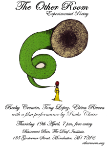 On my way to Fuel Cafe in Withington, the venue for this event, I discovered a man asleep in a standing position. I waited some time before stepping in, wondering if the event had already begun with a Fluxus style intervention. Eventually, I realised that this was not the case. This was just life in the malfunctioning space station that is Manchester with its crew of maddened droids plotting an inexorable course towards the heart of the sun.
