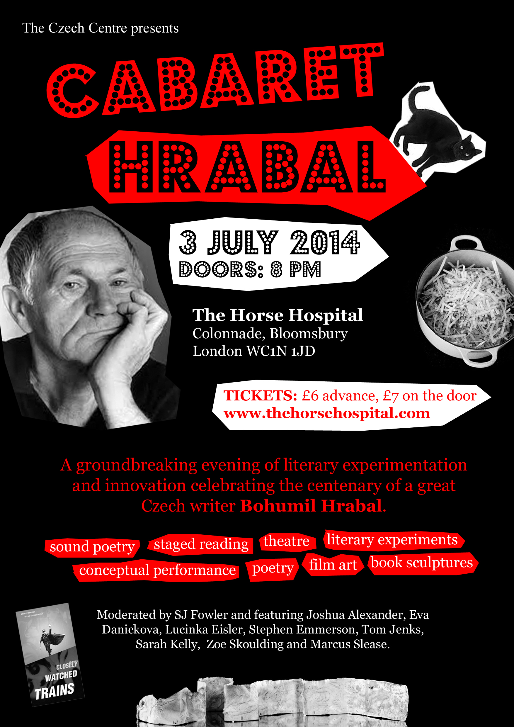 Featuring Zoe Skoulding (sound poetry), Sarah Kelly (book sculptures), Joshua Alexander (film art), Stephen Emmerson (conceptual performance), Marcus Slease (poetry), Tom Jenks (literary experiments), Eva Danickova (stage reading) and Lucinka Eisler (theatre), this is a chance to discover, or rediscover, a great European writer through new and exciting works that pay their debt to the remarkable achievements of Hrabal in the essence of their happening.