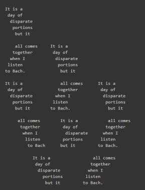 Karl Kempton, Thomas Fink, Maya D. Mason, John Xero, John M. Bennett, D.J. Huppatz, Daniel de Culla, Seth Copeland, Texas Fontanella, Jim Leftwich, Robert Lee Brewer, Jim Hanson, Olivier Schopfer, William Repass, Steve Dalachinsky, Kyle Hemmings, Craig Cotter, Jon Cone, Dah Helmer, Michael Farrell, Peycho Kanev, Richard J. Fleming, Cecelia Chapman, Jeff Crouch, Jack Galmitz, Philip Byron Oakes, J.J. Campbell, Sanjeev Sethi, Tom Montag, Darren C. Demaree, Hart Broudy, Neil Leadbeater, Volodymyr Bilyk, Stephen C. Middleton, Aidan Semmens, Karen Greenbaum-Maya, Sneha Subramanian Kanta, Bill Wolak, Pete Spence, Clara B. Jones, Andrew Topel, Andrew Taylor & David Spittle, Marietta McGregor, Faleeha Hassan, Diane Keys, Jesse Glass, Kenneth Rexroth, Katrinka Moore, Daniel Y. Harris, osvaldo cibils, Thomas M. Cassidy, Eileen R. Tabios, David Lohrey, Edward Kulemin, Jared Chipkin, Lakey Comess, Baron Geraldo, Shataw Naseri, Logan K. Young, AG Davis, hiromi suzuki, Hugh Tribbey, Anne-Marie Jeanjean, Caleb Puckett, Drew B. David, Jeff Bagato, Márton Koppány, Louise Landes Levi, Jill Chan, Alain Robinet, Raymond Farr, Dennis Andrew Aguinaldo, Willie Smith, Joe Balaz, M A McDonald, Jim McCrary, Sian Vate, Heath Brougher, Owen Bullock, differx, Lynn Strongin, Marcello Diotallevi, Robbie Coburn, Carol Stetser, Chris Brown, Richard James Allen, Grzegorz Wróblewski, Jeff Harrison, David Harrison Horton, Sjoerd van der Weide, Joel Chace, Indigo Perry, Simon Perchik, Richard Kostelanetz, David Baptiste Chirot, Timothy Pilgrim, Nicole Pottier, Natsuko Hirata, Massimo Stirneri, Rebecca Eddy, Josh Smith, major stafford sternwall, John Pursch, Sheikha A., Mercedes Webb-Pullman, Jared Pearce, Keith Nunes, Jake Goetz, Allen Forrest, sean burn, Richard Skelton, Tom Beckett, Shloka Shankar, Seth Howard, Tony Beyer, Sam Langer, Bob Heman, Cherie Hunter Day, Aurélien Leif, Catherine Fletcher, Johannes S. H. Bjerg, Pragya Vashishtha, Paul Pfleuger, Jr., Pam Brown, & Marilyn Stablein. Available here.