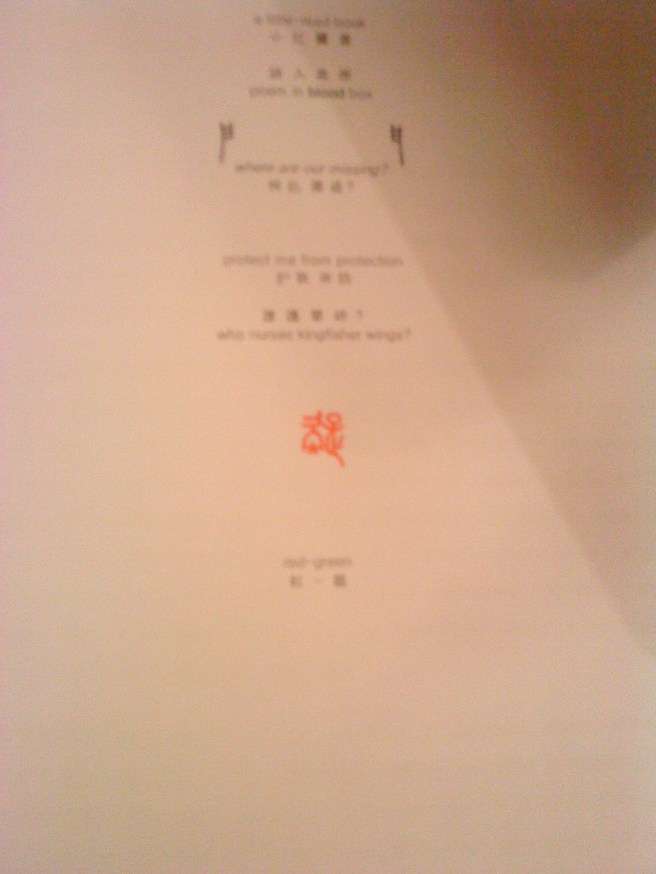 My Paintings are Invisible by Philip Davenport is a poem sequence combining Chinese and Western alphabets. The work is dedicated to Hai Zi (1965-89) the Chinese poet. Alphabets of East and West entwine to make word pictures, ‘invisible paintings’, each given an imaginary colour. They are on translucent paper, scripted half in Chinese (by Chinese artists) and half in English. The two alphabets sometimes join, sometimes separate. These are ‘paintings’ of absence, images that never grow clear – and Hai Zi becomes a symbol for all who are missing, all that we cannot say.