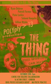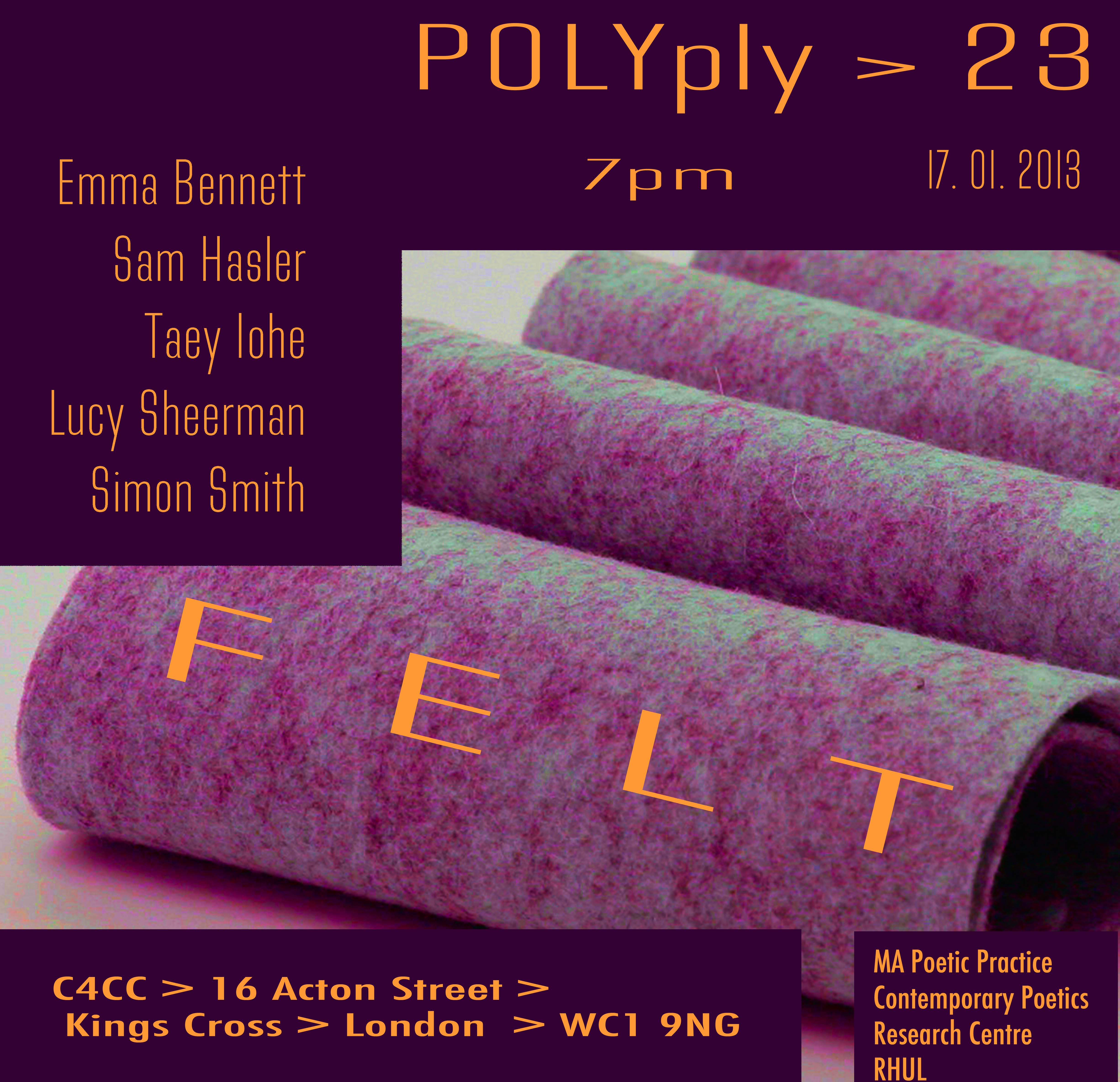 Thursday 12 December The Centre for Creative Collaboration 16 Acton Street, London WC1X 9NG Free entry, 7pm Royal Holloway Poetics Research Centre and MA Poetic Practice, Royal Holloway.
