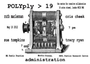 Friday 7 December. The Centre for Creative Collaboration, 16 Acton Street, London, WC1X 9NG. Free entry. Contemporary Poetics Research Centre and MA Poetic Practice, Royal Holloway.