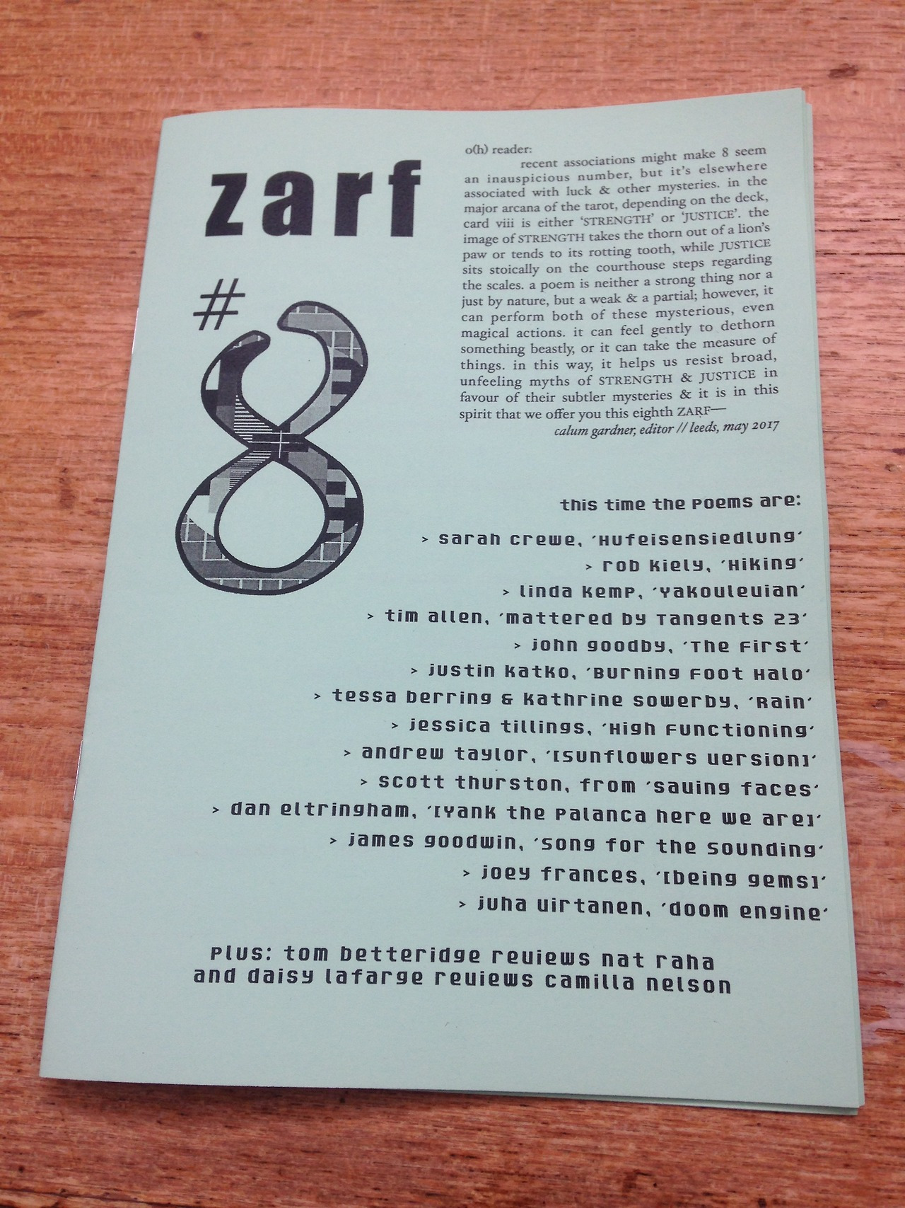 ZARF is a magazine of new experimental poetry based in the UK. Poems from: Ali Znaidi, Tom Bamford, Amy McCauley, Giles Goodland, Tomos Morris, Keith Tuma, David Spittle, James Davies, Nia Davies, Annabel Banks and Julia Rose Lewis, Arjun Rajendran, Chandramohan S., John M. Bennett, Patrick Riedy, and Nat Raha, and back cover by David Greenslade, plus: Julia Rose Lewis reviews Nia Davies and e.v. moore reviews Verity Spott!