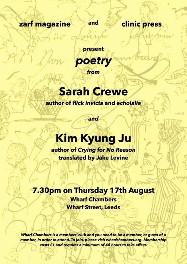 Zarf and Clinic are collaborating to host Kim Kyung Ju, a leading Seoul-based poet, dramatist and performance artist, with a new pamphlet out from Clinic Press, and Sarah Crewe, whose publications include ‘flick invicta’ and ‘echolalia’.