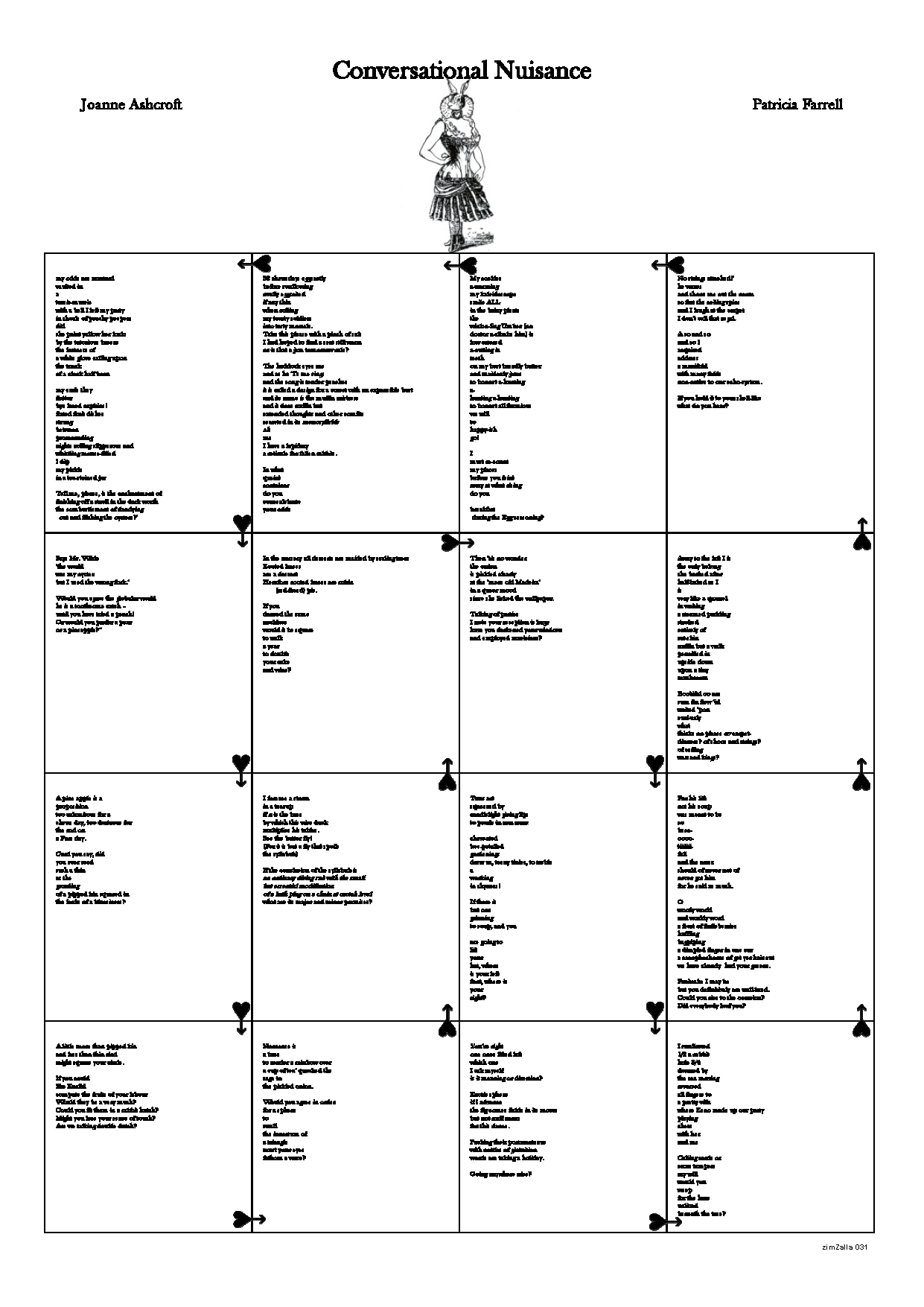 The new zimZalla object is Conversational Nuisance, an A3 size directional poster poem with anthropomorphised rabbit insignia by Joanne Ashcroft and Patricia Farrell. More at the zimZalla site.