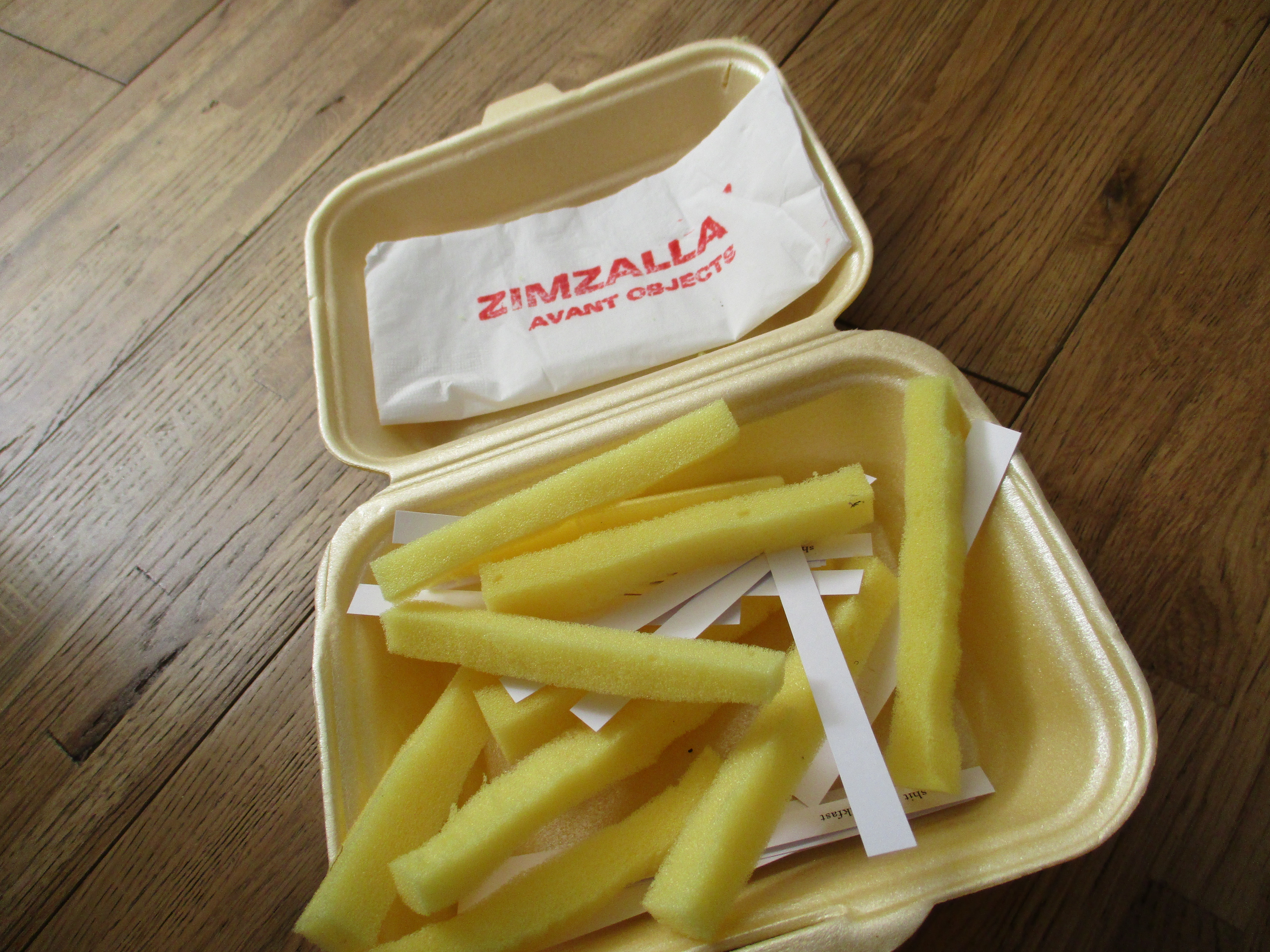 zimZalla object 032 is Takeaway Britain by Sue Birchenough, a combinatorial card poem in a styrofoam box with cold chips and a branded napkin. More at the zimZalla site.